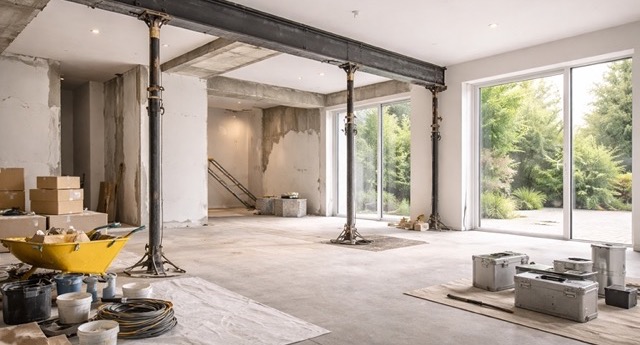 Verwijderen van dragende muren, plaatsen van stalen liggers en herindelingen binnen bestaande woningen.