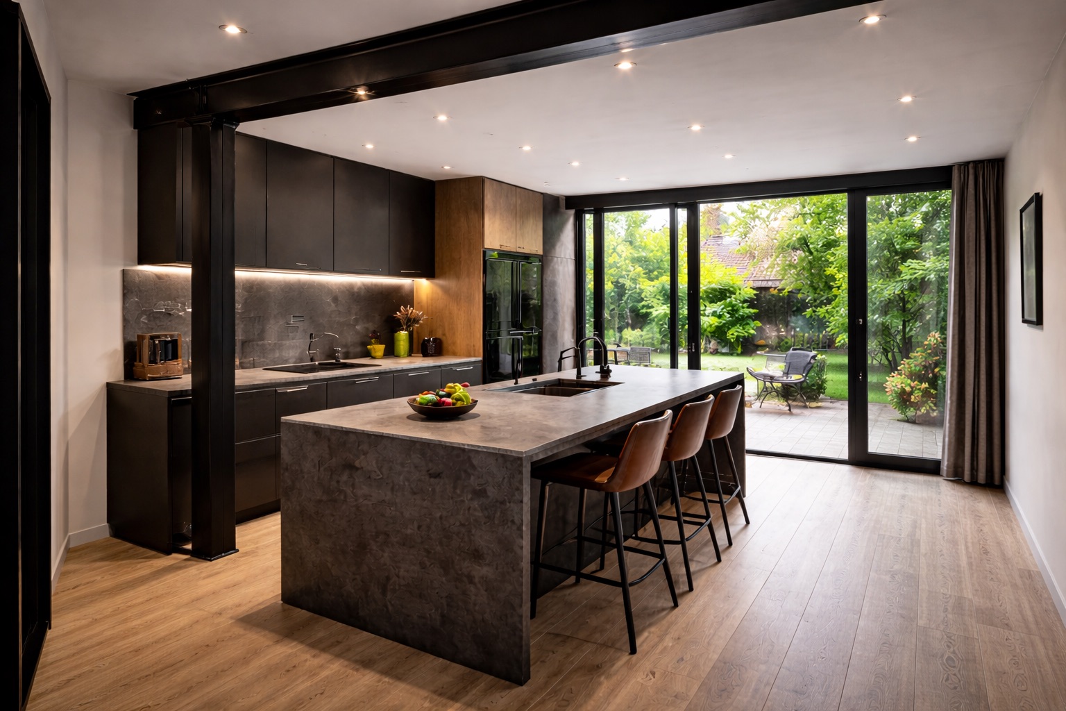 Door het verwijderen van de dragende wand en het plaatsen van een stalen ligger is een open leefruimte gerealiseerd met directe verbinding naar buiten. De nieuwe indeling combineert een modern kookeiland, hoogwaardige materialen en geïntegreerde verlichting voor een ruimtelijk en eigentijds resultaat.