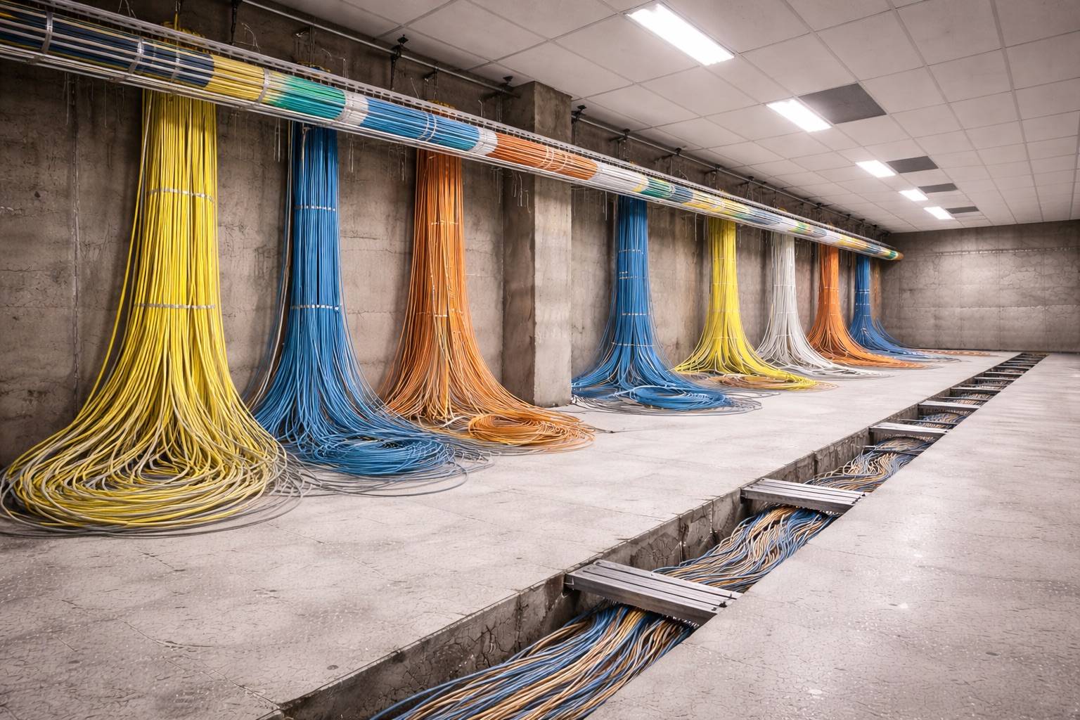 De ruimte bevond zich in een ruwe installatiefase met zichtbare bekabeling, open kabelgoten en onafgewerkte technische voorzieningen. De infrastructuur was nog niet gestructureerd en vereiste volledige organisatie en afwerking.